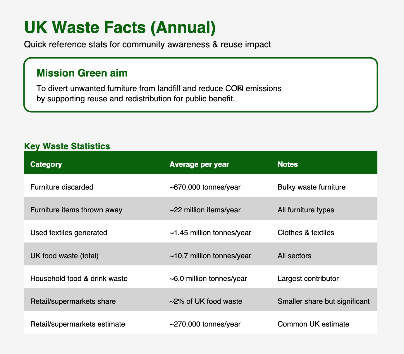 Mission Green is always searching for people who want to help us at our furniture outlets. Most of our PR is done through the web and media, and we always need people who might want to pass their knowledge to the local schools, councils, and companies.